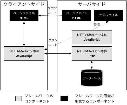 これら、定義ファイルとページファイルを作る事で、INTER-Mediatorは機能します。いずれのファイルもサーバに保存しますが、多くの部分がJavaScriptで稼働しており、データベースから取り出したデータをページに埋め込む作業はクライアントのWebブラウザ内で行います。
