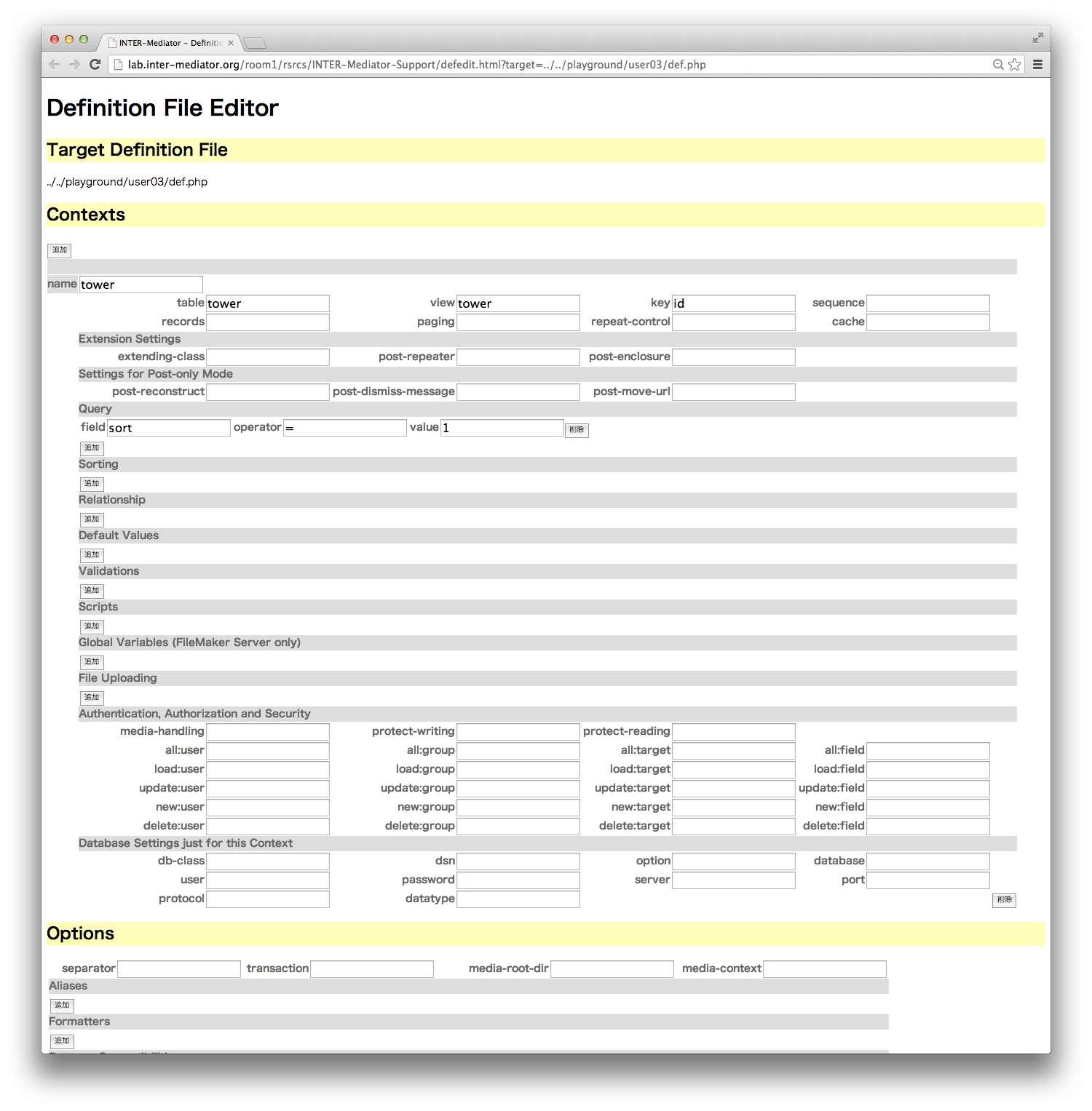 query、sort、relationについては複数の設定が可能なので、「追加」や「削除」ボタンが用意されています。必要なら「追加」ボタンをクリックして、設定を追加し、テキストフィールドに必要な記述を行ってください。